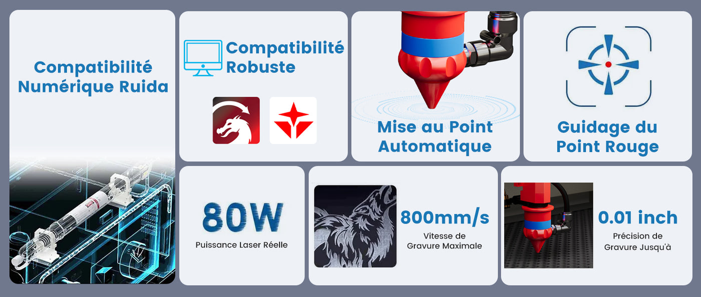Augmentez votre efficacité et atteignez des vitesses de gravure impressionnantes avec notre machine à graver laser de 80 W. notre appareil permet des gravures rapides et précises sur une grande variété de matériaux.