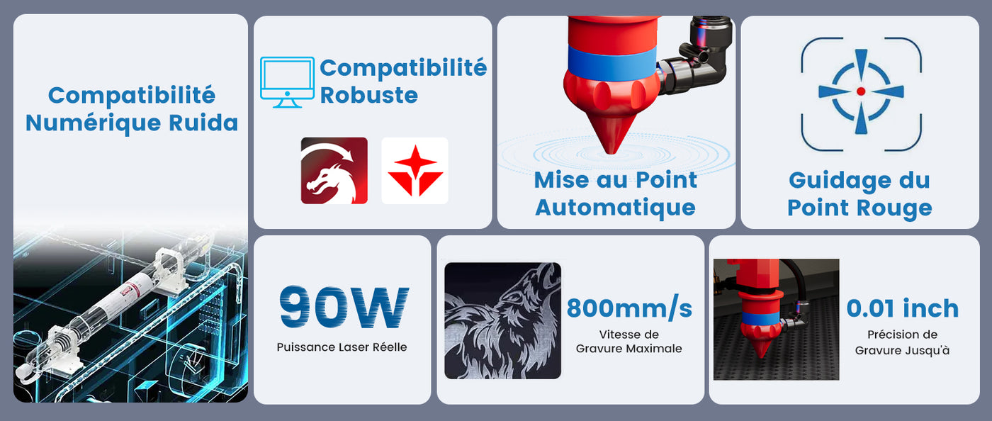 Augmentez votre efficacité et atteignez des vitesses de gravure impressionnantes avec notre machine à graver laser de 90 W. notre appareil permet des gravures rapides et précises sur une grande variété de matériaux.