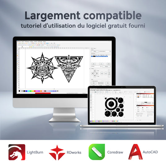 Lightburn et RDWorks sont parfaitement compatibles avec cette série de produits. Grâce à RDWorks, vous pouvez l'utiliser avec des logiciels de dessin tels que CorelDRAW (CDR) et AutoCAD (CAD).