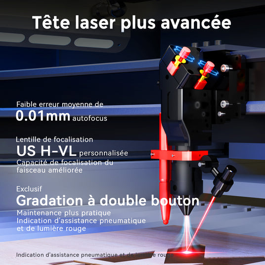Monport a également repensé et amélioré la tête laser, en utilisant une lentille de mise au point US II-VI, un module de mise au point automatique de plus haute précision (avec une erreur de seulement 0,01 mm), et en même temps, le système de gradation a été optimisé pour réaliser facilement l'action de gradation à l'aide de seulement deux boutons. Tous ces éléments amélioreront considérablement l'expérience de l'utilisateur et permettront un traitement efficace et de haute qualité.