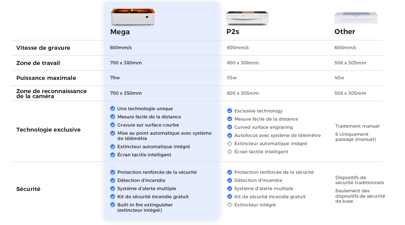 La technologie laser intégrée de Mega (avec un système de télémétrie basé sur le LiDAR) atteint 100% d'autofocus et la vitesse de gravure atteint 1000 mm/s. Même en cas de gravure rapide, notre système garantit une grande précision.