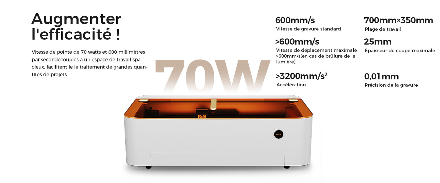 Dites adieu aux restrictions de taille ! La généreuse zone de travail de 700*350mm permet de traiter des projets de grande envergure jusqu'à la microgravure en série en une seule opération, ce qui augmente considérablement votre productivité !